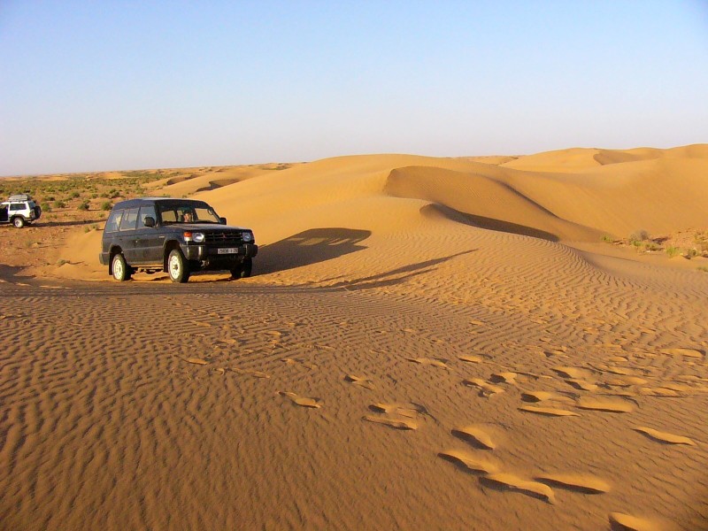 Pendant plusieurs km nous roulons dans un terrain pierreux il faut prendre des précautions nous avons qu'une roue de secours par véhicule , sur celui de location les pneus n'étaient pas en très bon état . Le soleil commence a baisser quand nous arrivons dans le sable impossible d'arriver a El Hagounia avant la nuit .Nous décidons de bivouaquer dans les dunes.